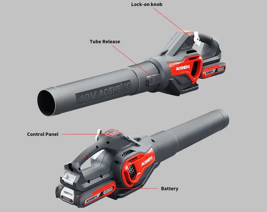 1. Găsiți conexiunea dintre tub și suflantul de frunze cu baterie cu litiu A40CF900HEB01 40V: La suflantul cu frunze cu baterie cu litiu A40CF900HEB01 40V, această conexiune este de obicei situată în partea din față a suflatorului de frunze, lângă orificiul de evacuare a aerului și este concepută pentru a fi foarte stabilă pentru a se asigura că nu va cădea ușor în timpul utilizării.