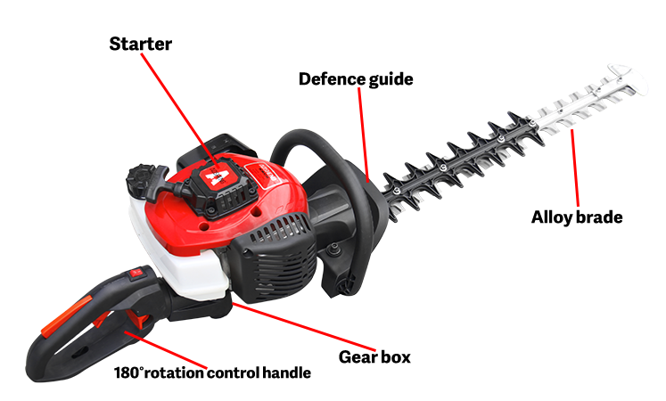 | 02MÂNER DE CONTROL DE ROTARE 180°Acest mâner suportă o rotație de 180, face utilizatorii mai confortabili atunci când tăiați gardul viu. |